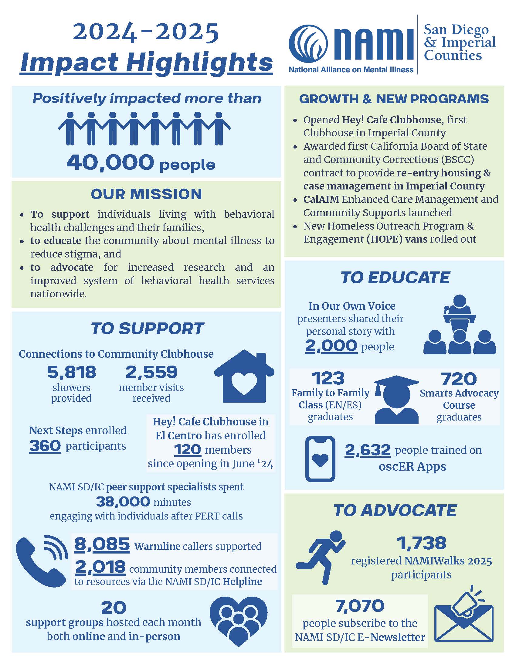 NAMI San Diego envisions a well-integrated group of people living with mental illnesses and others affected by mental illnesses working together to reach all of the community with NAMI programs.
