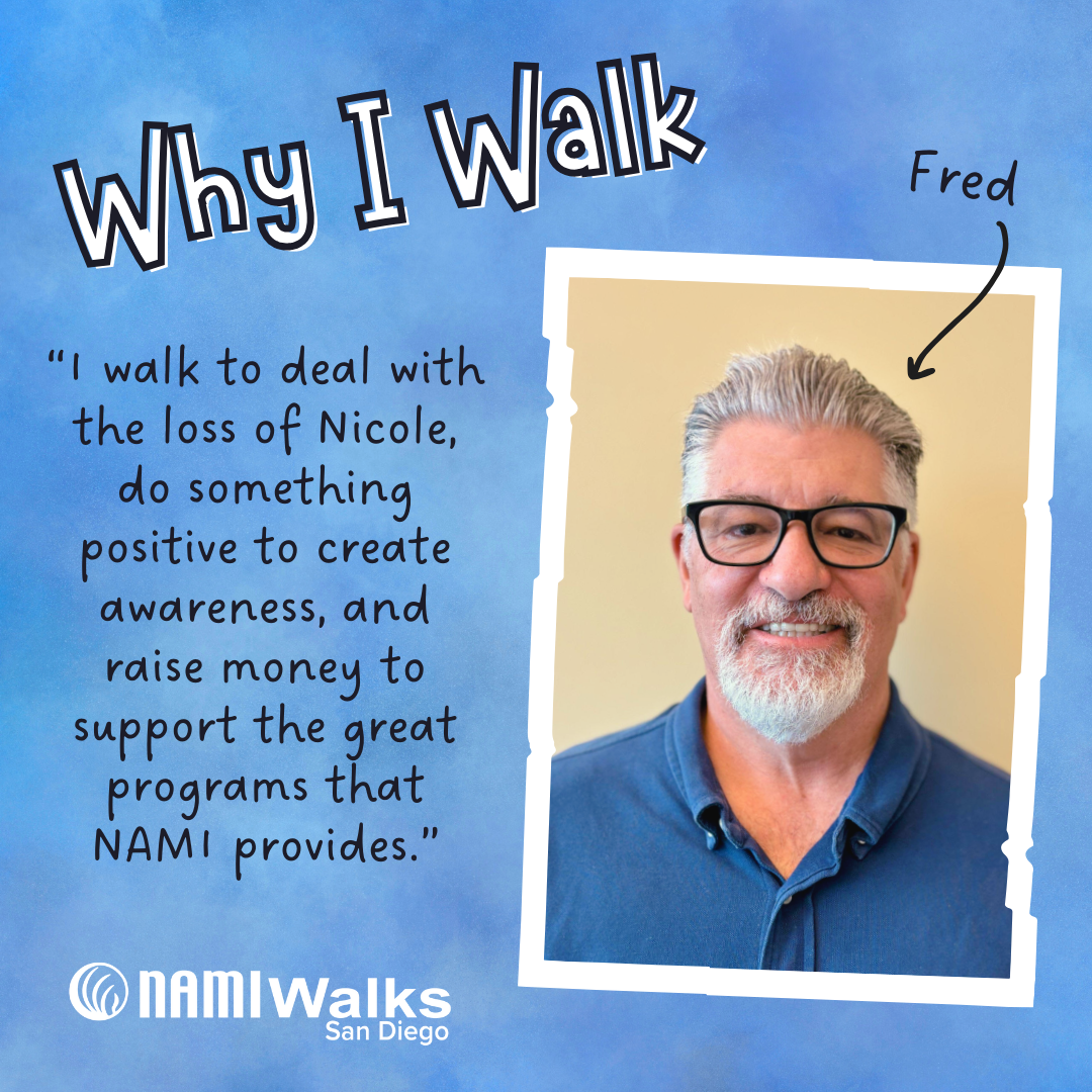 “I walk in memory of my daughter Nicole who passed away in 2019 after years of suffering from mental illness and substance abuse. Her passing left a big void in my life and I made the decision to support NAMI and the walk as a way to deal with her loss and do something positive to create awareness and raise money to support the great programs that NAMI provides. The annual walk also gives me a chance to keep her memory alive with my family and friends. I have been walking now since 2020 and every year has been a great experience to not only raise money but connect with other people who have similar stories."